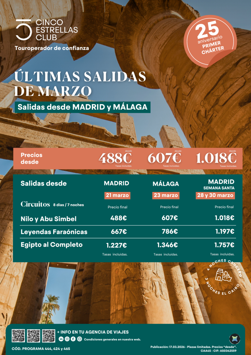 Últimas Plazas sal. Marzo |Egipto dsd 488€ Madrid: 21.03 PVP 607€ Málaga23.03 y Semana Sta Mad 1.018€ 28y30.03